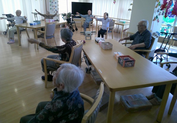 昨日は、三階で体操を行いました。食堂にて、しりとりゲームなども