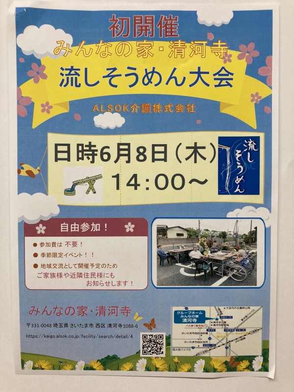 こんにちは!さいたま市西区清河寺のグループホームみんなの家清河寺です! 夏が近づき、暑さが増してきましたが、そんな中6月8日(木)流しそうめん大会を開催する事になりました!!そうめんを食べながら、職員のギター演奏を聴きながら♬ということもありですね(^^♪ぜひ楽しみにして頂きたいです!(*^▽^*)今回は地域交流を目的として企画した参加費無料のイベントですので、ご近所の方々お誘い合わせの上、ひとりでも多くのご参加を心よりお待ち致しております!!