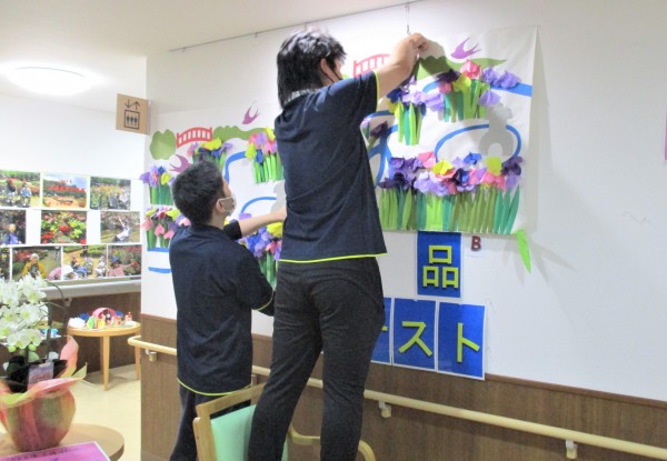 大きな模造紙を花菖蒲で埋め尽くす為、花と葉を時間かけて沢山作りました。