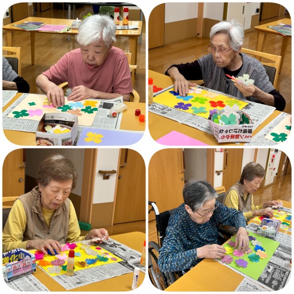 ①画用紙の色を選ぶ ②貼る柄を3種類(朝顔、四つ葉、桜)から1つ選ぶ ③貼る配置を考える ④ノリで貼る