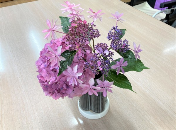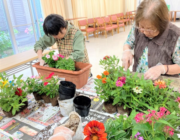 園芸クラブの日は朝から大雨でしたので、普段花壇を担当して下さっているご利用者様と一緒にプランターの植え替えをしました♪