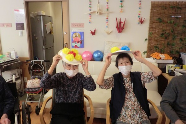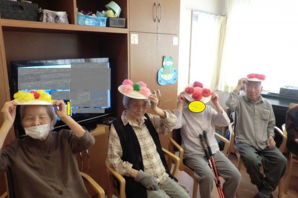 皆様にも作成を手伝っていただいた花笠を持っていただきて、雰囲気を楽しんでいただきました。