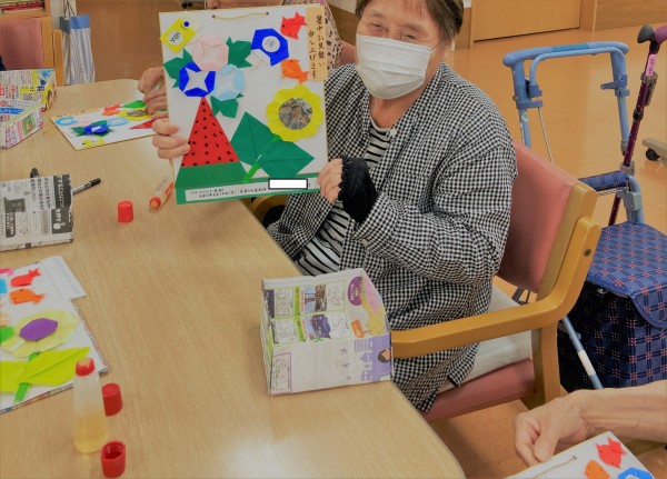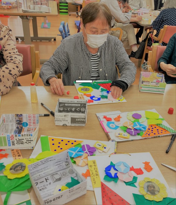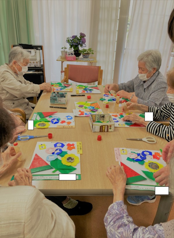 見本を見ながら、どんなふうに貼っていますかねー。これはー・・・夏に合わせてのお花貼りでしょうか
