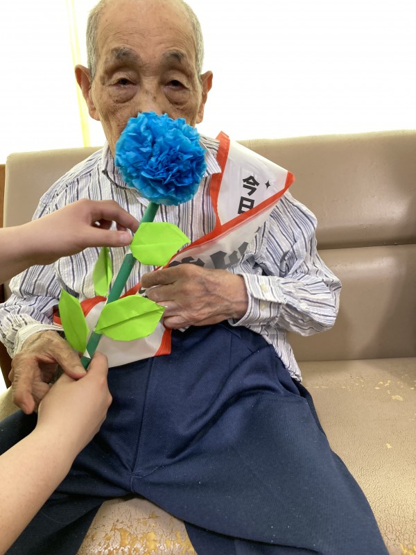 ホームからは青色のカーネーションと賞状、手作りのメッセージカードをプレゼントさせて頂きました。