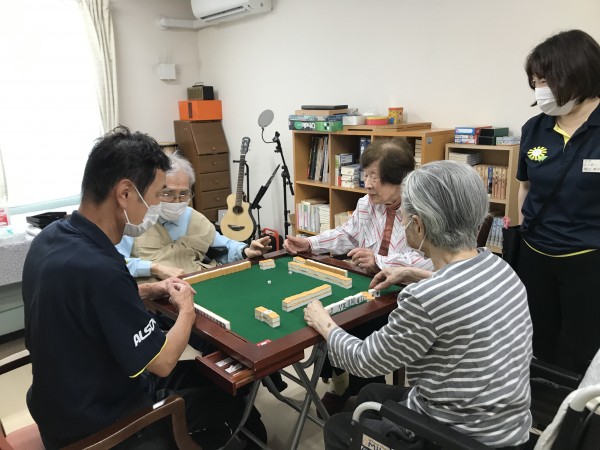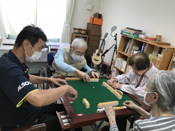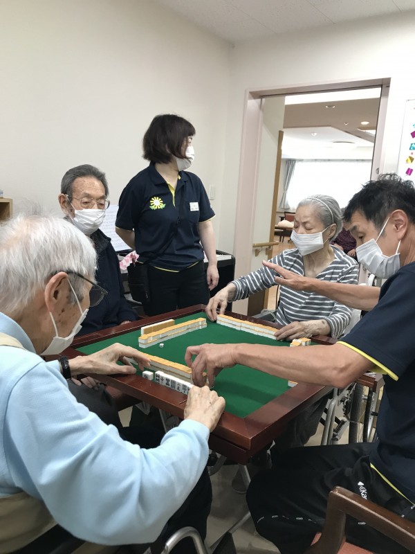 最近ご入居された方で、麻雀がとても好きな方がいらっしゃいます。今までは人数が揃わず、せっかく麻雀台があるのに出来ない状態が続いていましたが、麻雀が出来る様になりました。今までやりたいと思っていた方も麻雀が出来る様になりとても喜ばれています。