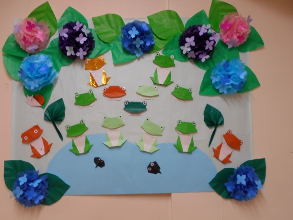 お花紙と折り紙を使って紫陽花を作り、真ん中にはたくさんのカエルが登場です!!