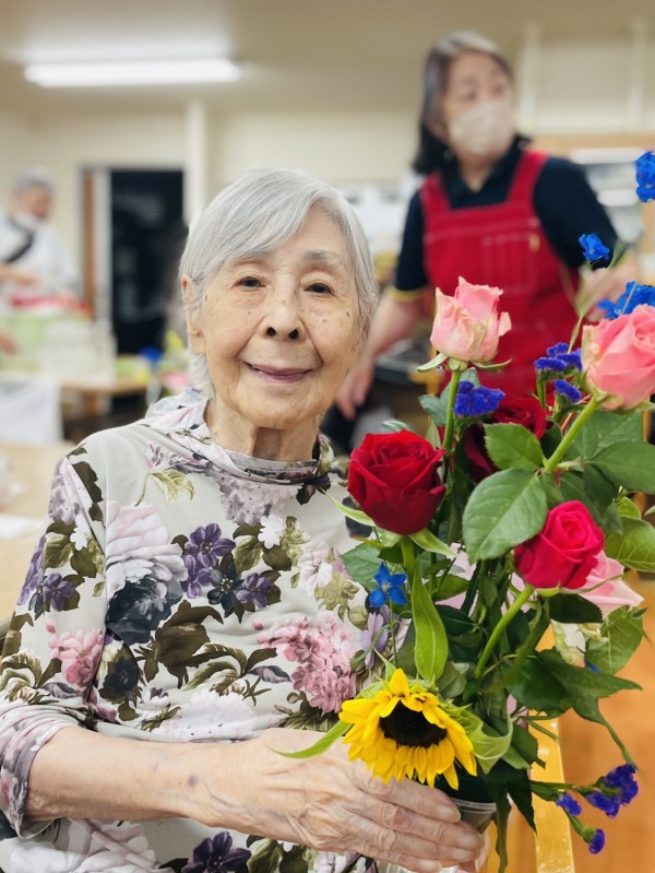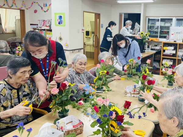 フラワーアレンジメント教室。。ここ数年で入居された方も多いので初参加の方や、デイサービスに通われていてその後グループホームに入居された方は顔なじみだったりと和やかな雰囲気のまま約一時間たっぷり、きれいなお花を生けました。