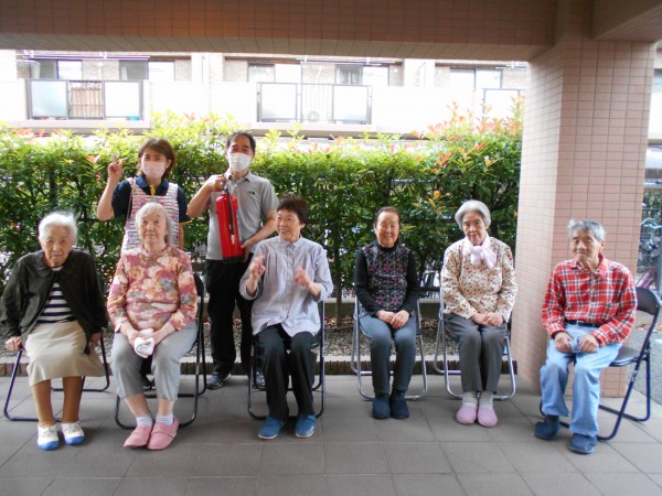外では希望されたご利用者様がスタッフと一緒に訓練用の消火器を使い消火訓練を行いました!