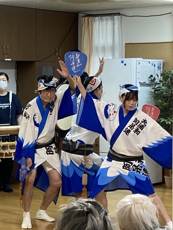 組踊りが終わると、楽器の紹介・ご利用者様の近くまで踊りに来て下さるのですが…
