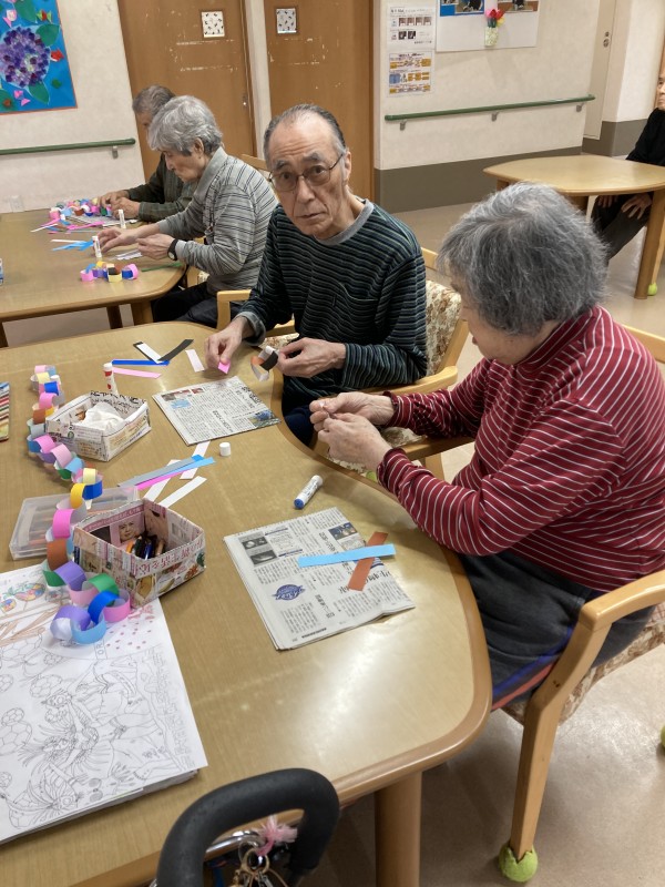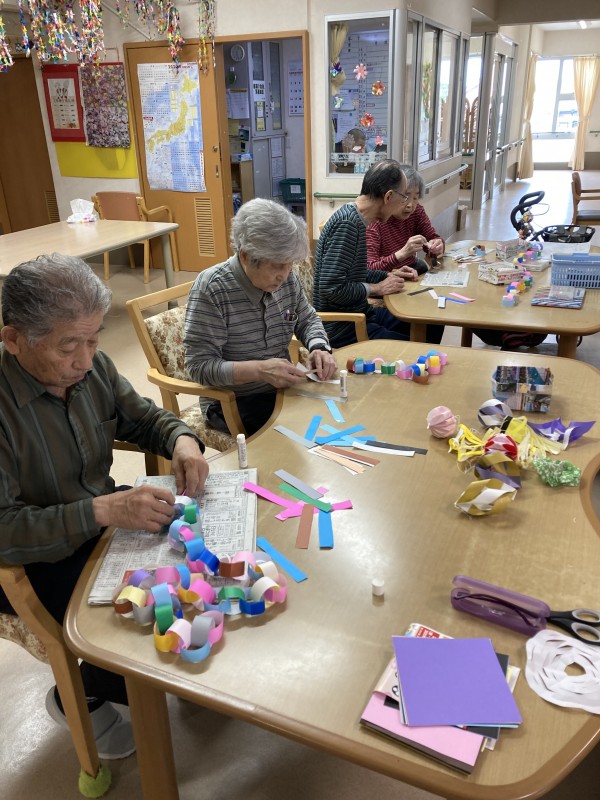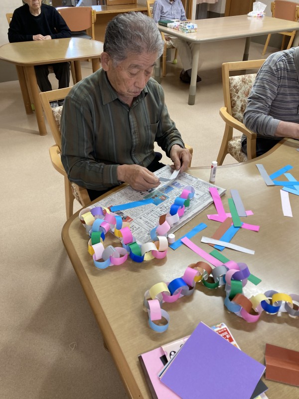 こんにちは!さいたま市西区清河寺のグループホームみんなの家清河寺です。本日は皆さんで七夕の飾り作成をして頂きました(*^^)v皆さん上手に鎖を繋げてくれました。誰が一番長くつなげられるかな(*'▽')競争です! 飾り付けが楽しみですね(^O^)/