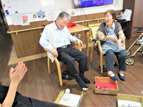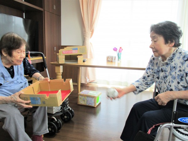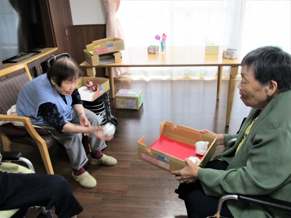 お皿に乗せて隣の人に渡したり、箱に投げ入れたり、足で蹴り入れたりします。
