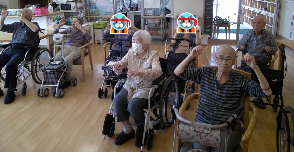 1階の食堂に集まってもらい、 皆で楽しく、体を動かしました。