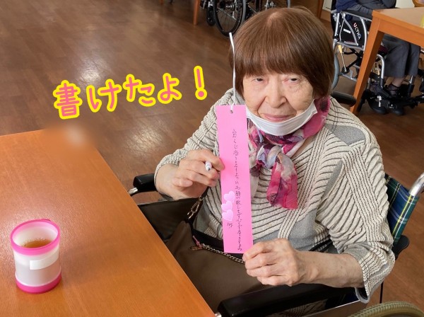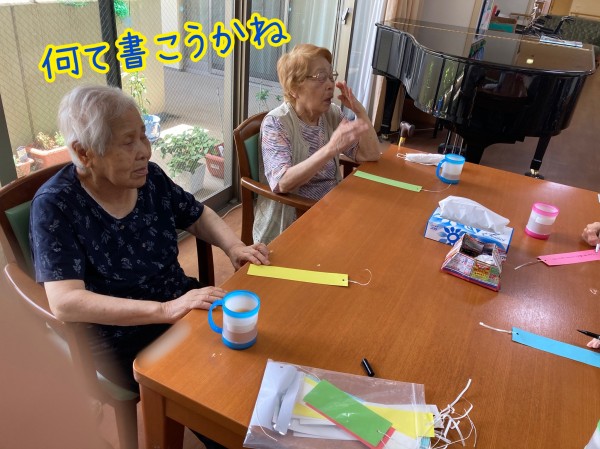 お喋りガールズの皆様、今日も仲良く短冊に願いを書きます。