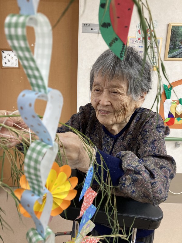 笹に願い事の短冊や、折り紙でつくった色とりどりの飾りを飾られました。