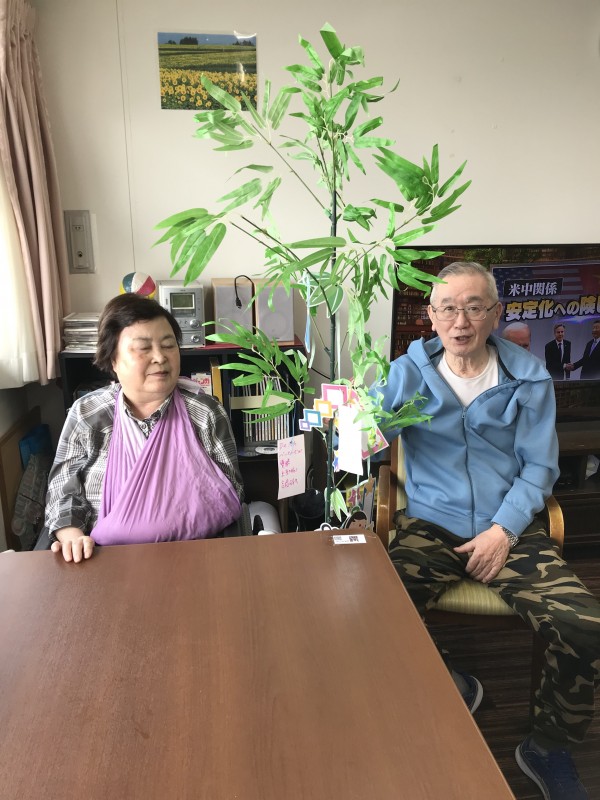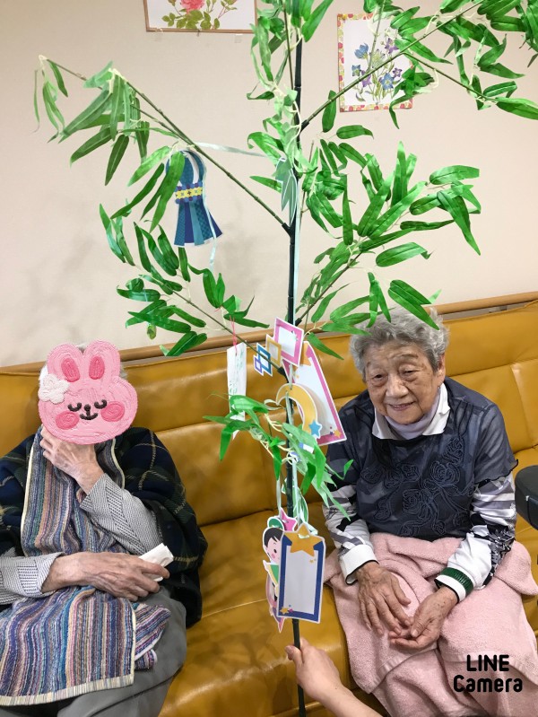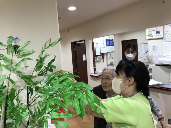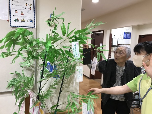 先日飾った笹に入居者様に短冊に願いを書いていただきました。