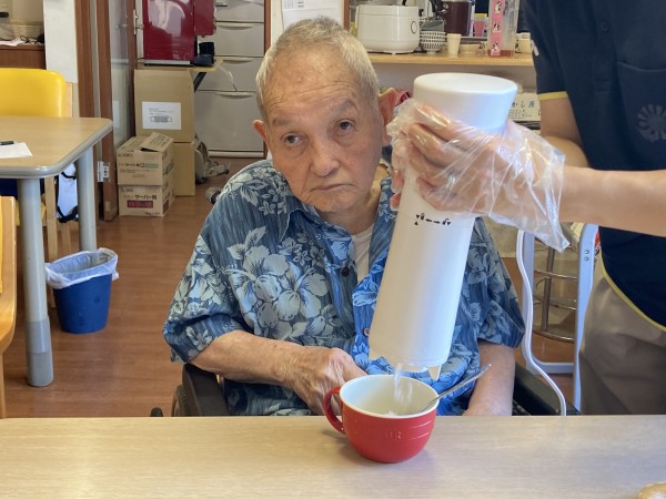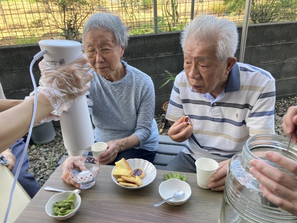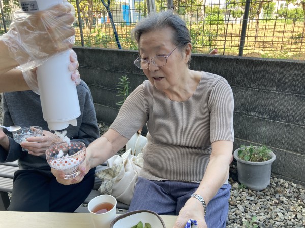 冷たいお茶におやつ、かき氷、畑で採れた枝豆もテーブルに並べます( *´艸`)