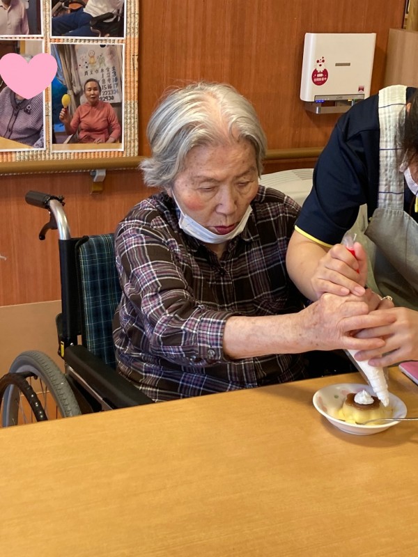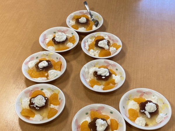 皆様、手際よく、プリンの上に、缶詰のみかん、ホイップクリームを