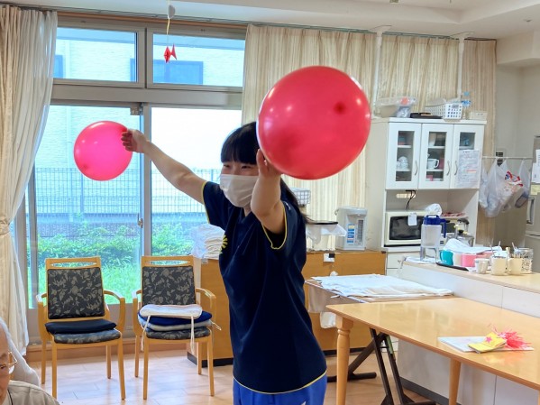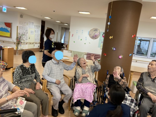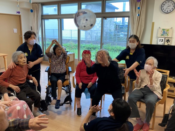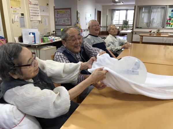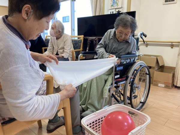 バスタオルを使って風船落とさないようにを隣の人に渡したり、風船バレーをしたりと大盛況