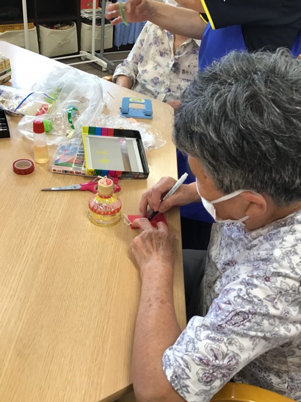 ペットボトルの上部を使ってマジックで模様を書いたり、