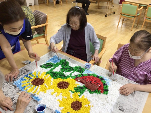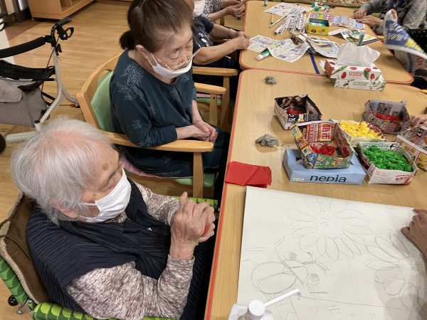 お花紙を丸めたものを、どんどん貼って頂きます!