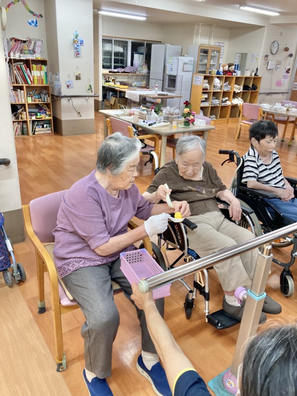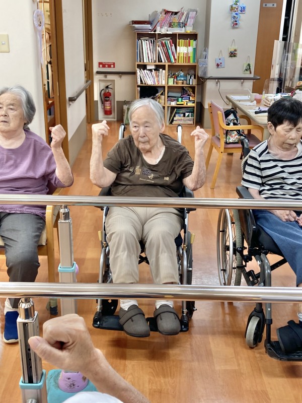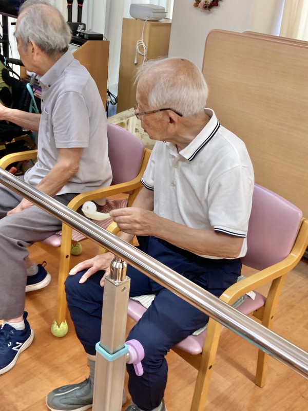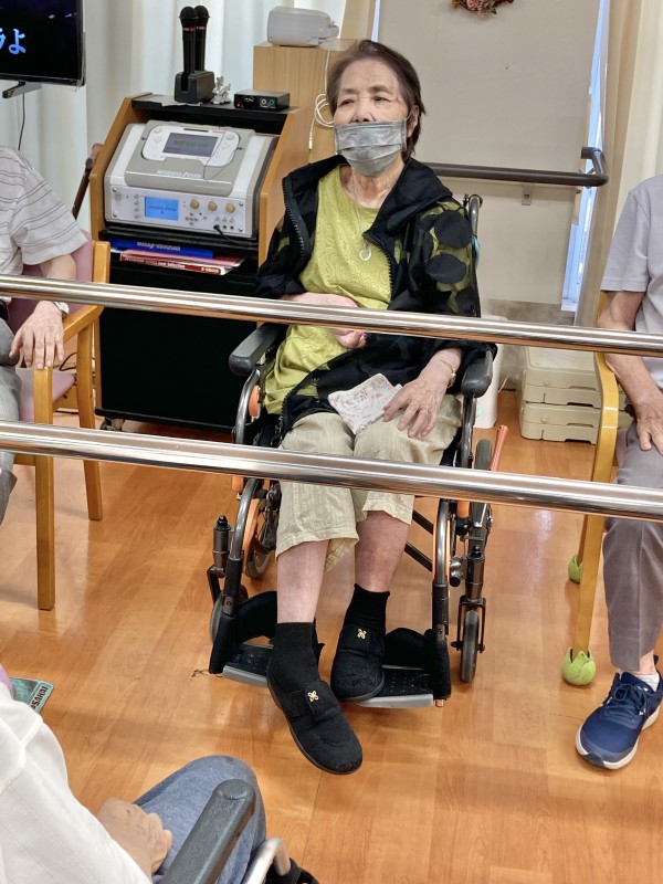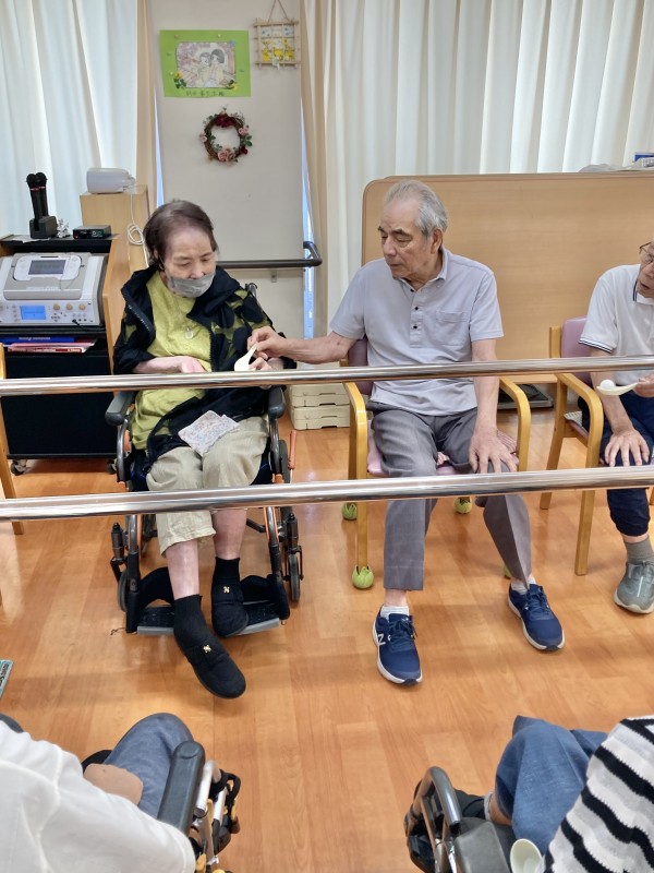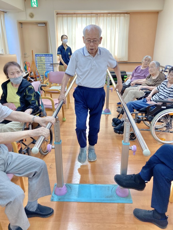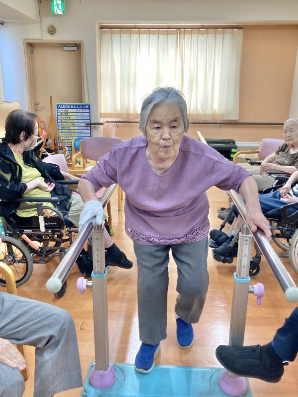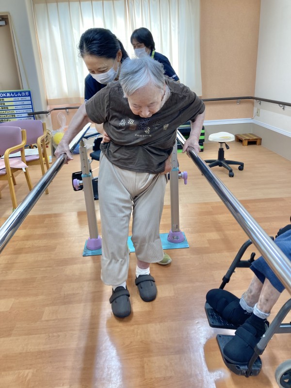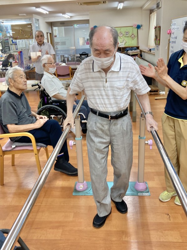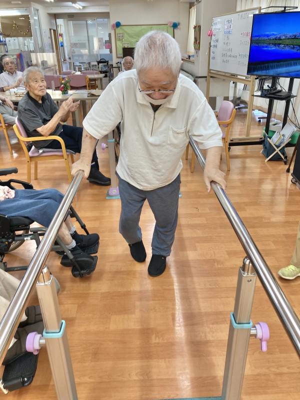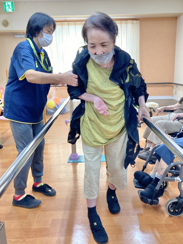 レク終了後、誘導時に平行棒を使って歩いて頂いています。往復されている方もいました。