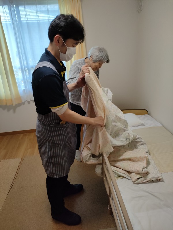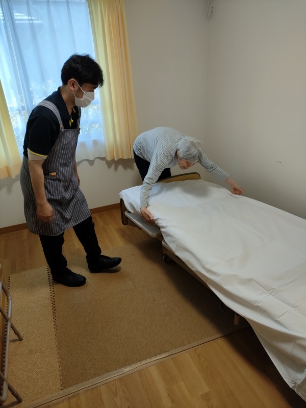 とある日の午前中、スタッフがシーツ交換をしていたところ「自分のベッドだから私やりますよー」とお手伝いしてくださいました。