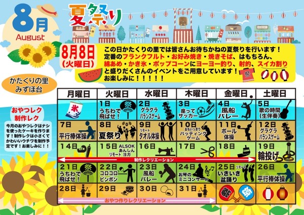 夏祭りやお琴のミニコンサートなど8月も楽しみなイベントが盛り沢山です!