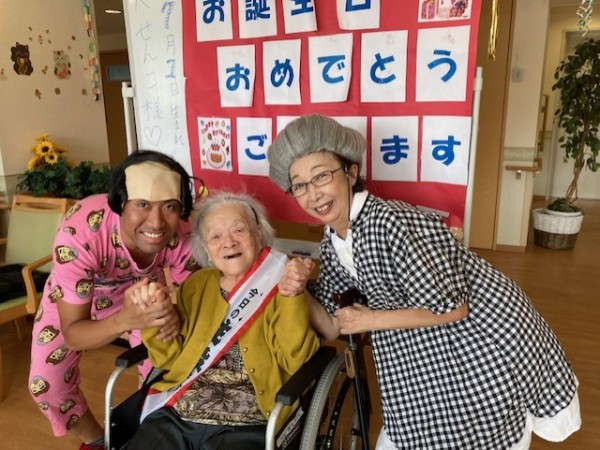 お誕生日のお祝いなのに、この人達は誰なんでしょう?? ん???「東村山から来た変なおじさん?」「その横にいる人は???」突然の来訪者にご本人もビックリ!!