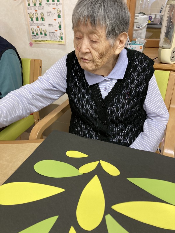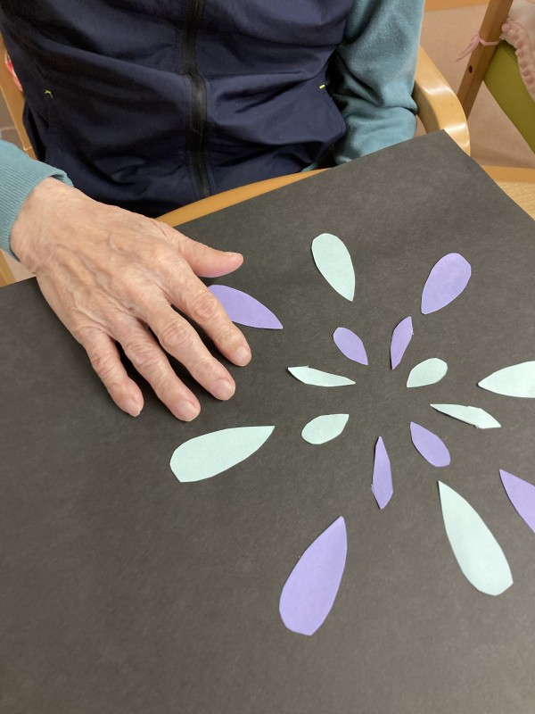 皆様で色紙を切ったり、貼ったりして花火のように飾りつけしました。