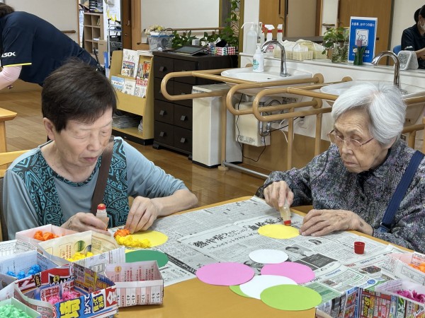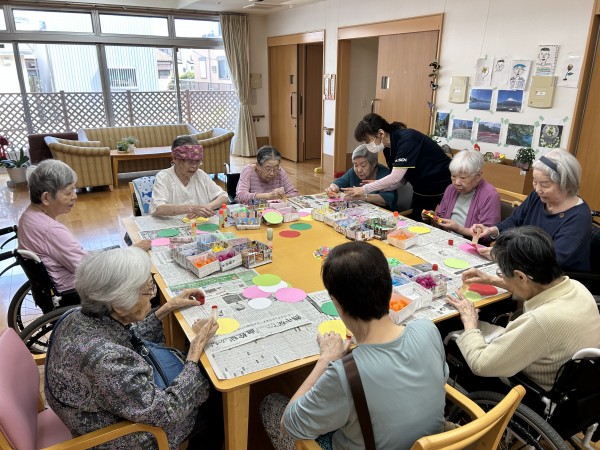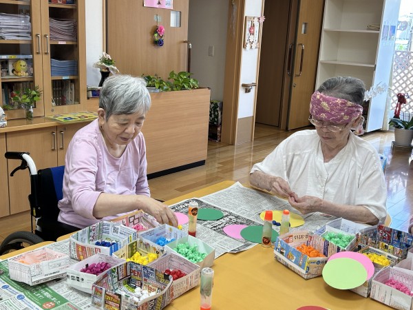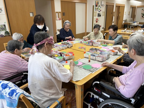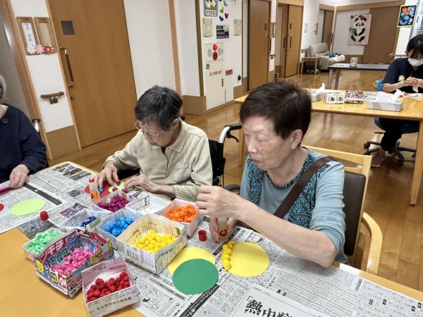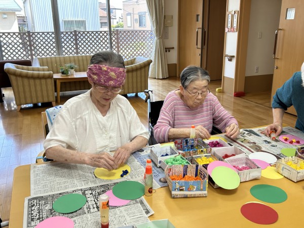 先日1階の入居者様のコロコロお花紙を丸めて頂いた物を使って今日は2階3階の方もお誘いして【工作レク】を行いました。