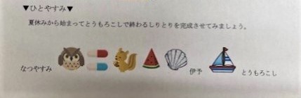 なつやすみ → (写真のイラストを見て考えてみてください) → 伊予 → (イラスト) → とうもろこし
