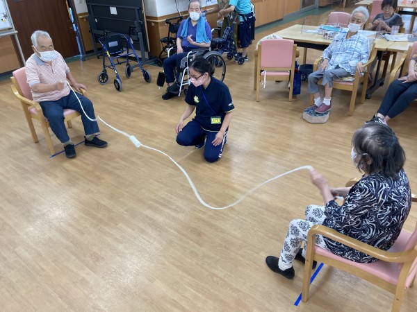 紐に通したテッシュケースを、時間いっぱいで相手の方に少しでも追いやるゲームです!(^^)!