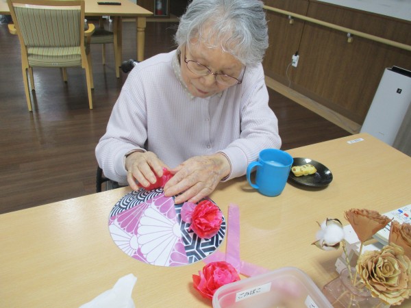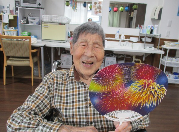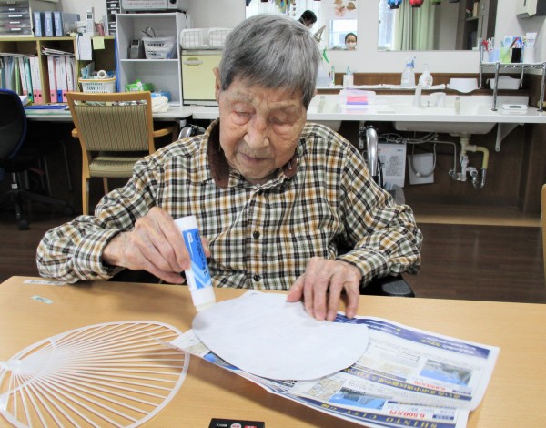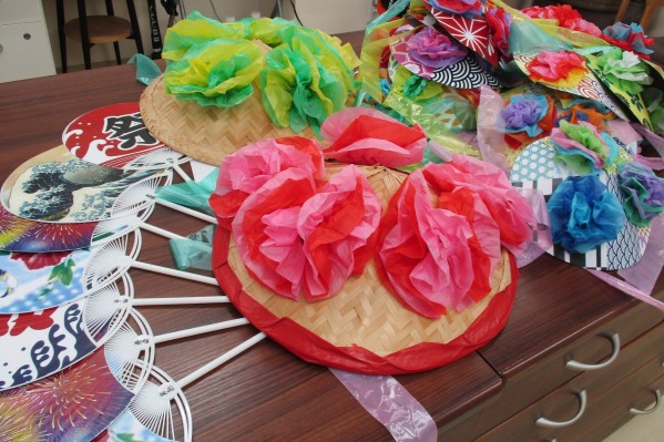 今月に入って各階ごとに盆踊りグッズ、マイうちわ・マイ花笠を作りはじめました。