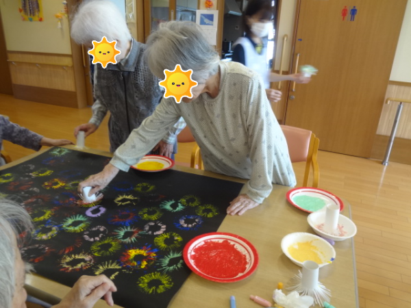 トイレットペーパーの芯に絵の具を付けてポンポンと黒い模造紙に押して作成しました(*^▽^*)