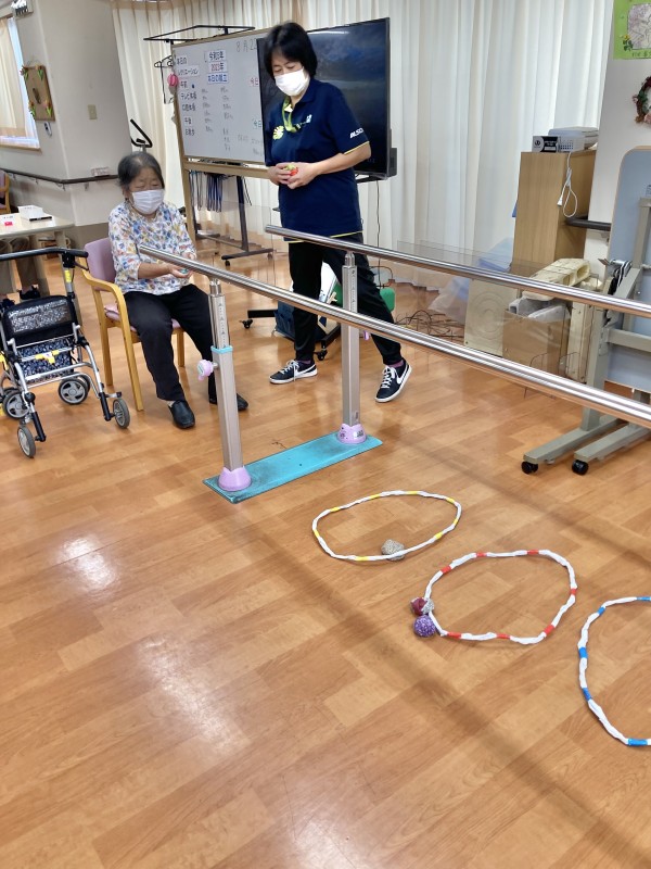平行棒に、赤・黄・青の輪っかを置いて、お手玉の投げてもらいます。
