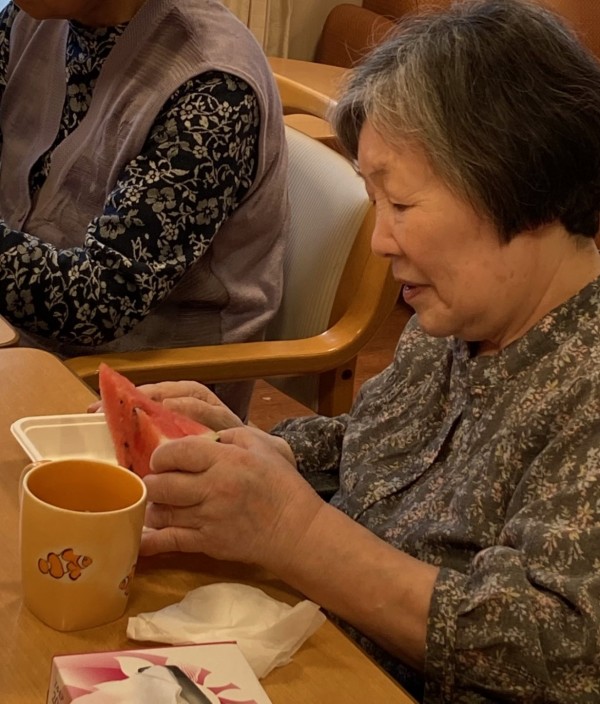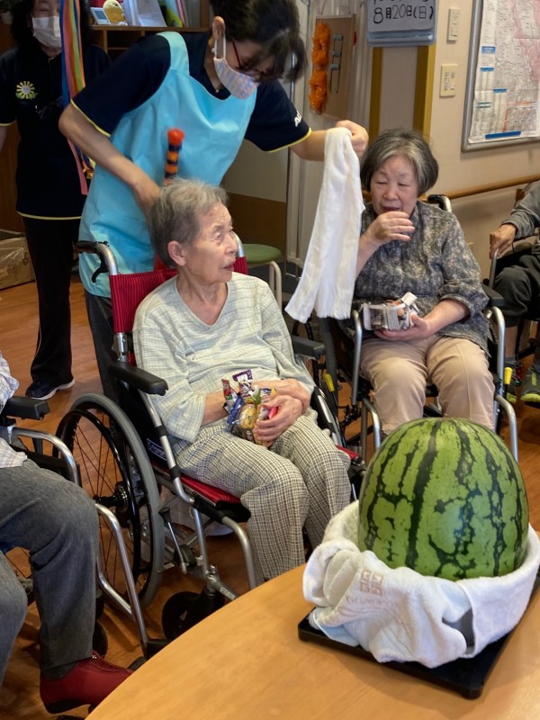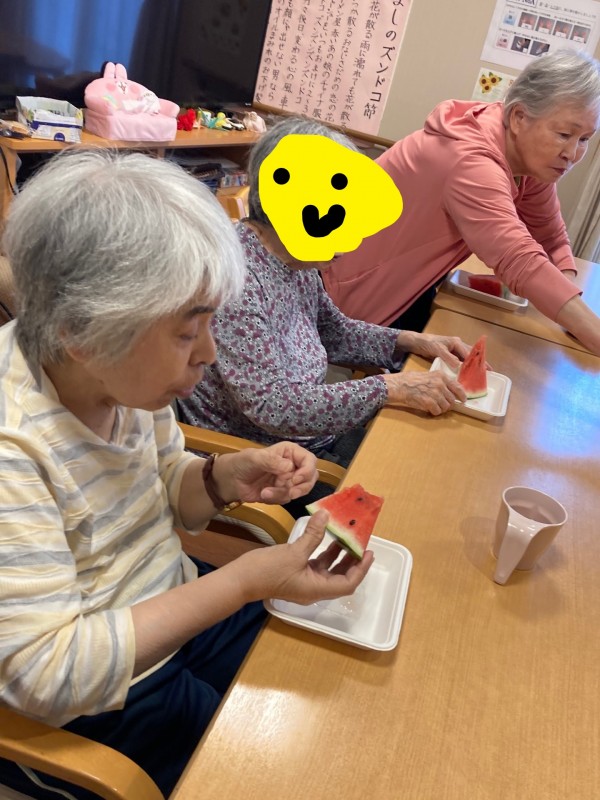 待ちきれないので、職員が、木っ端微塵にスイカを華麗にカットしました(^^♪ おやつはスイカです