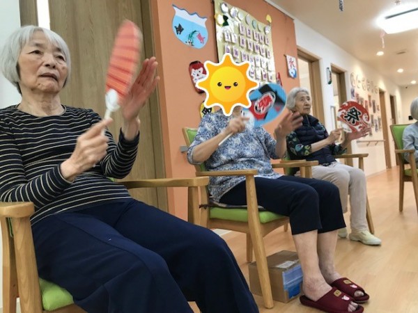 先日、リモート盆踊りに参加しました。事前に御利用者様にうちわを作って頂き、「花笠音頭」と「東京音頭」オリジナルの振り付けで。