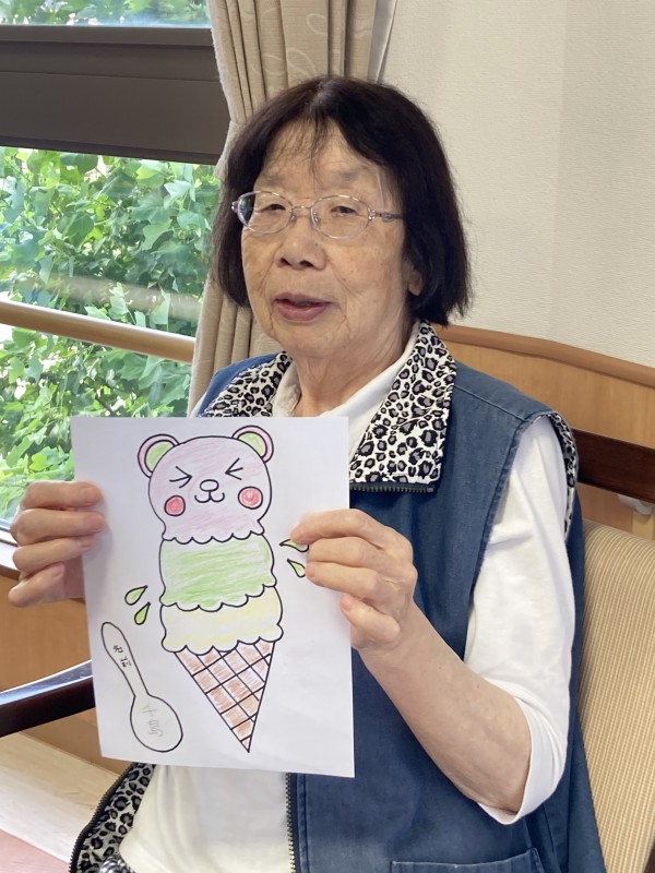 男性ご利用者様も、職員と相談しながら冷たそ~な色合いになるよう色鉛筆をチョイス。