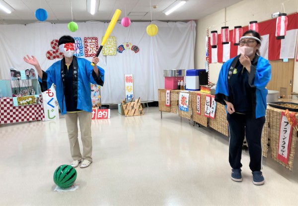 大玉スイカをかけてスタッフによるフロア対抗スイカ割りが行われておりました。笑