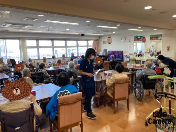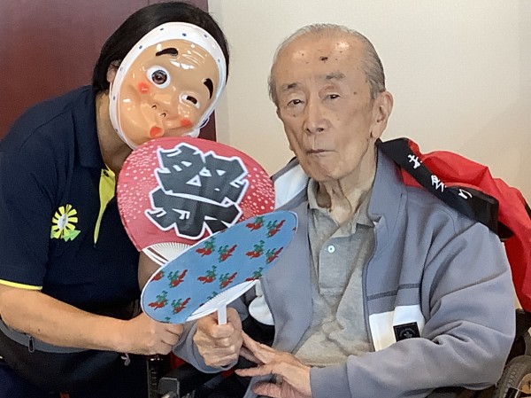職員がひょっとこのお面付けて周ると皆様喜ばれました。