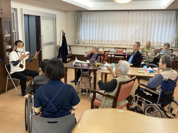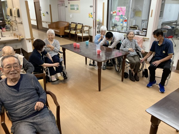 ご自身で体を動かす事が難しい方は、職員の介助で一緒に体操に参加しました。今日は台風の関係で大雨なので今日は屋内でのレクを行いました。体操や食事レク等日々様々なレクが行われています。今後とも楽しいホームを目指していきます。