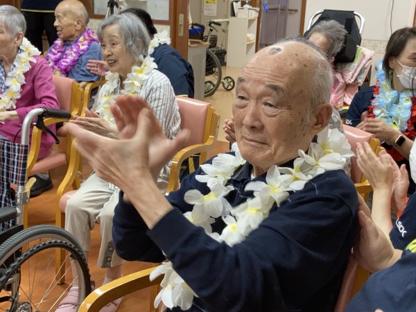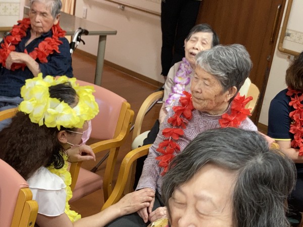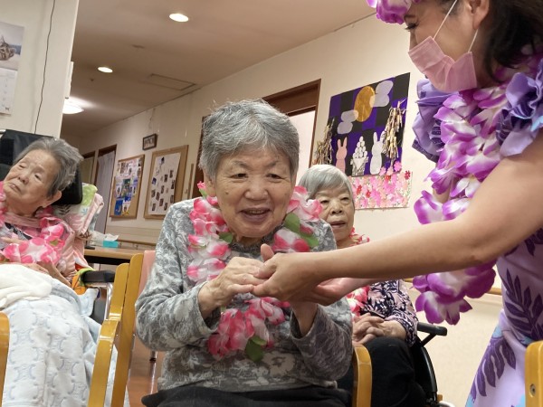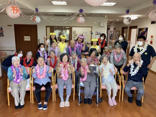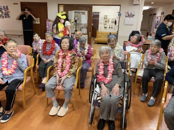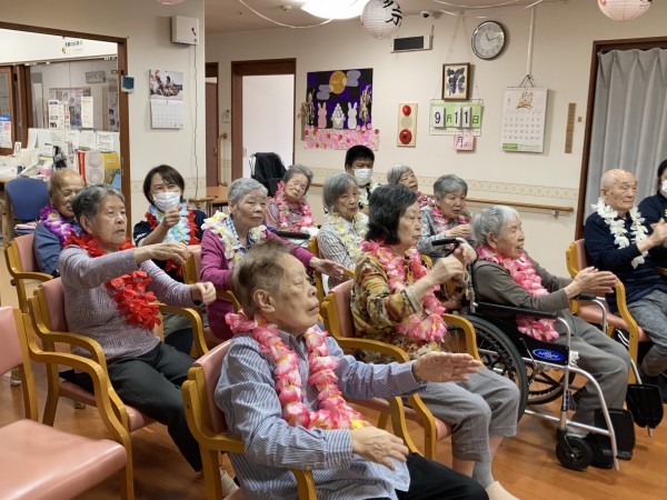 利用者様の表情がより笑顔になり、曲の振り付けをレクチャーされ利用者様も職員も一緒にフラダンスショーを楽しみました!