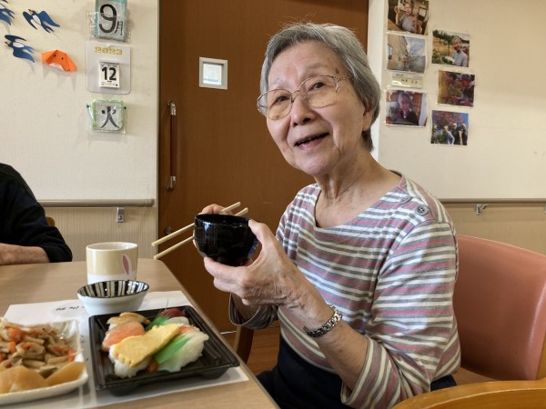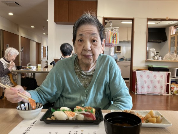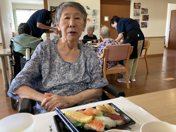 お寿司は、はまち・まぐろ・びんちょう鮪・いか・サーモン・えんがわ・たまご・煮あなごを