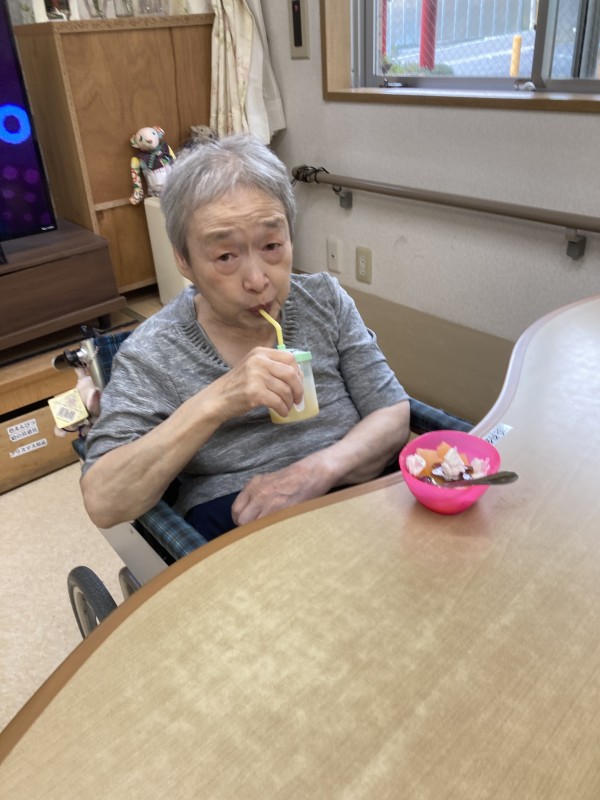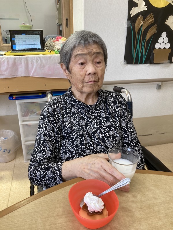 敬老の日のおやつは、皆さんが大好きなプリンアラモードです。