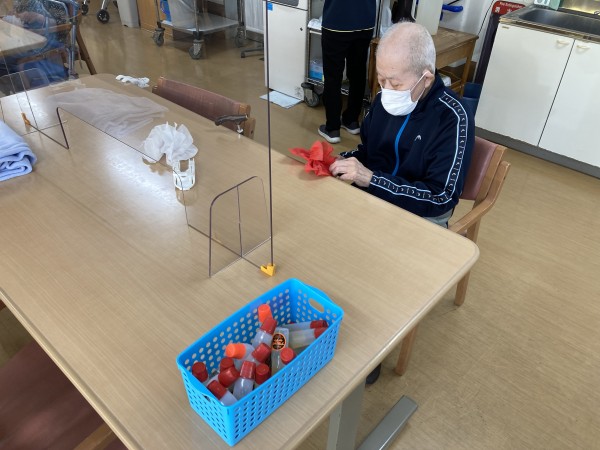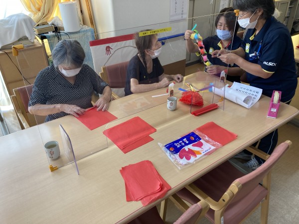 男性陣は折り紙を短冊状に切った輪飾り、女性陣はお花紙で花づくりを、皆様真剣な