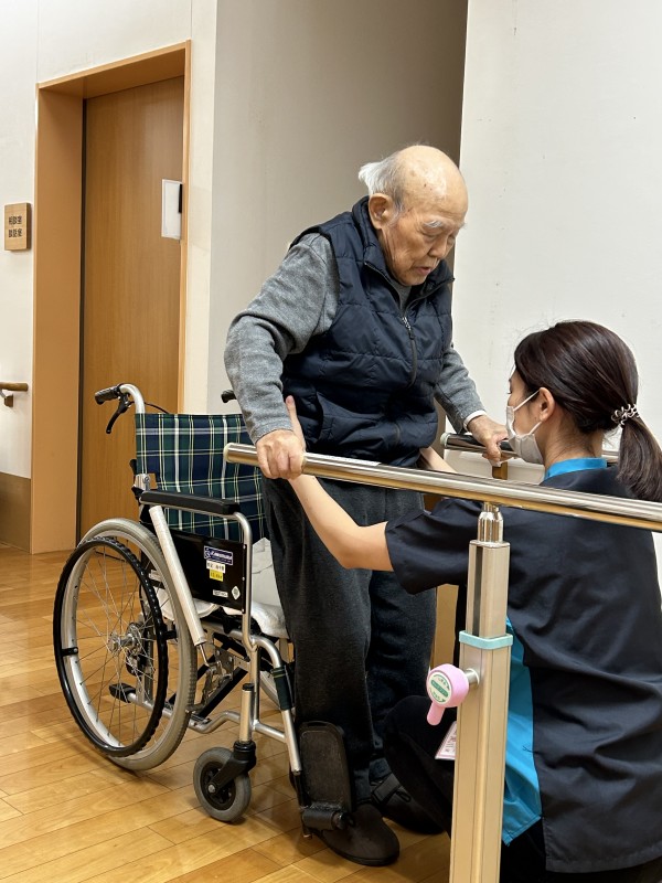 元々姿勢正しく綺麗に立っていらっしゃるですが、平行棒を使って片足立ちの訓練や歩く時の視線の位置などをPTさんからアドバイスを受けた後は、益々胸をはり颯爽と歩かれていました。