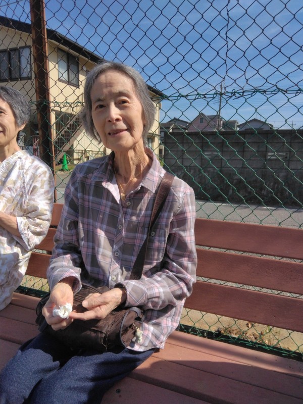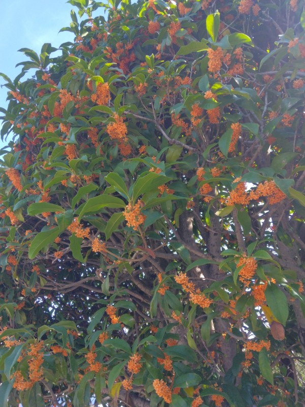 手のひらに金木犀の花を乗せてもらい、香りを楽しみます。