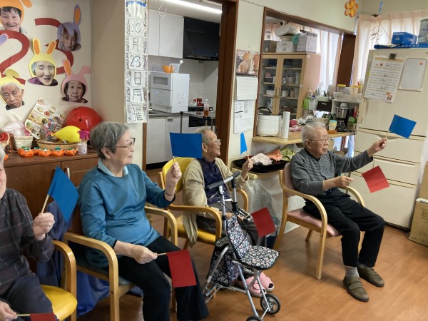 風船リレー・玉入れ・旗揚げ。フォークダンスと皆様一所懸命に