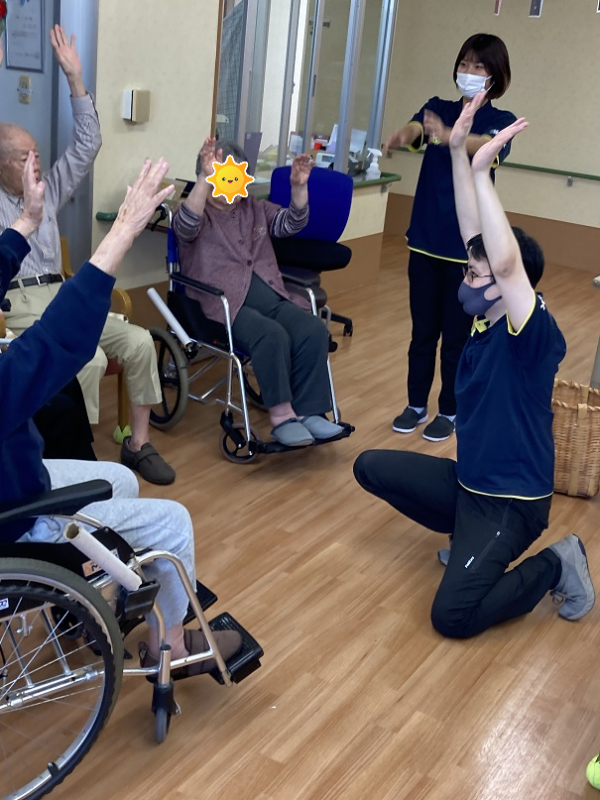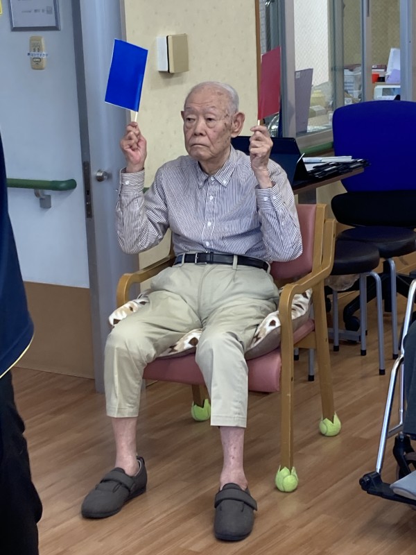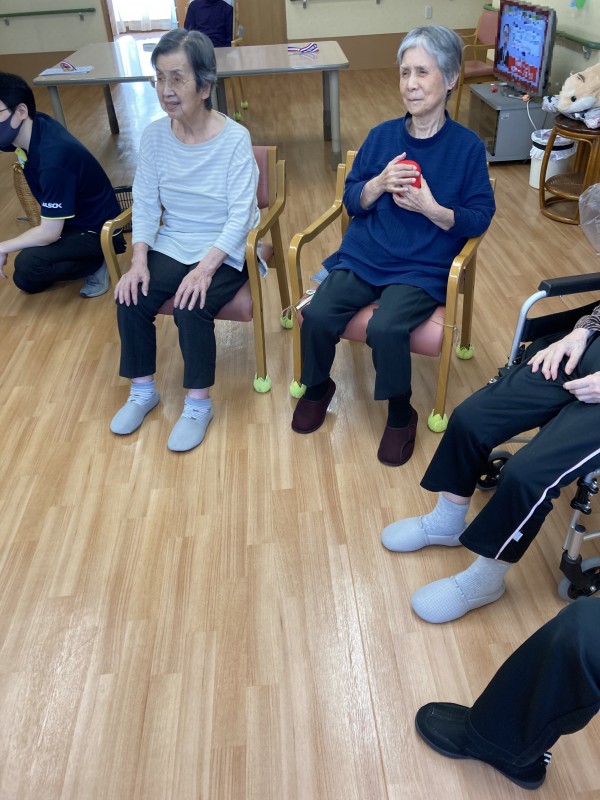 まずは風船バレー、続いて玉入れを行っていただきます。ケアスタッフの補助がなくても皆様頑張ってくださりました。
