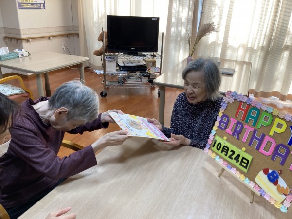 職員と他の利用者様で「誕生日おめでとうございます」とお祝いをされると「ありがとうございます!」と、とても素敵な笑顔で言われ大変喜ばれました。
